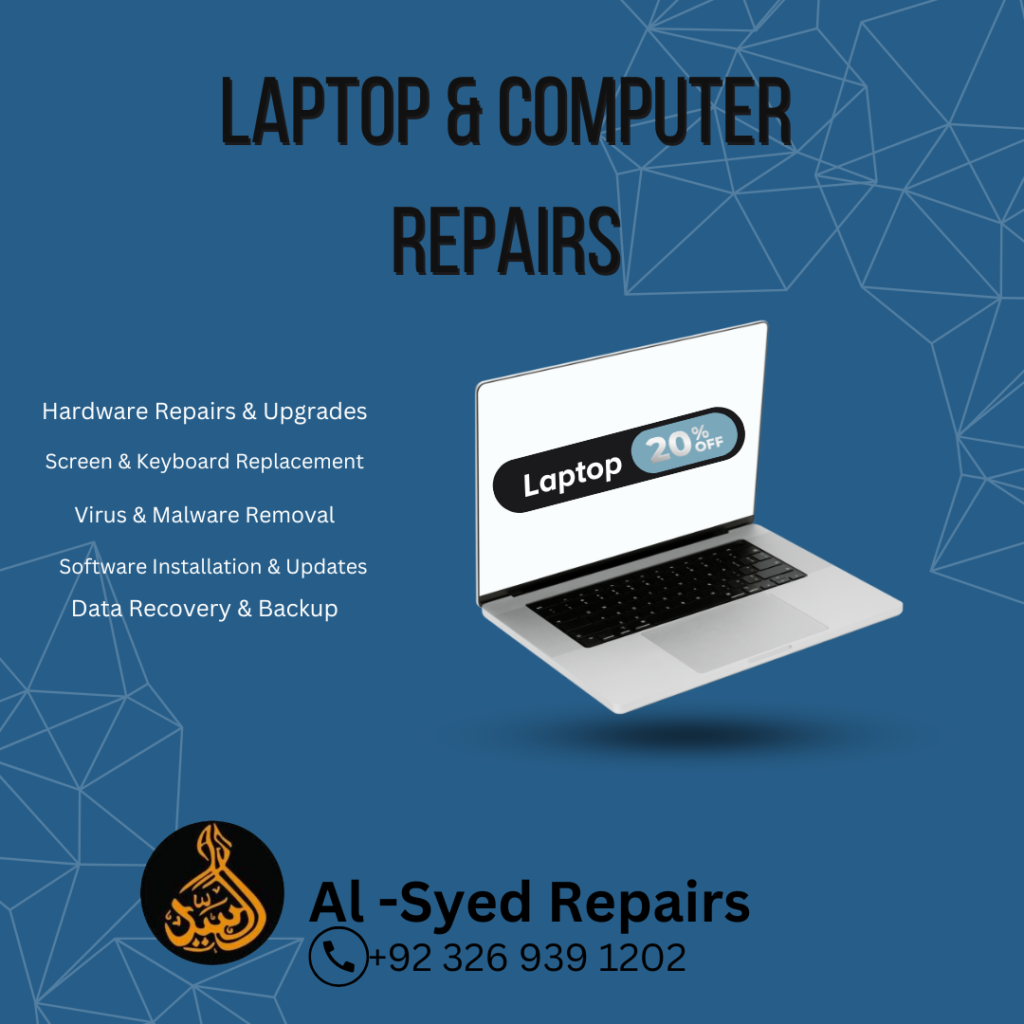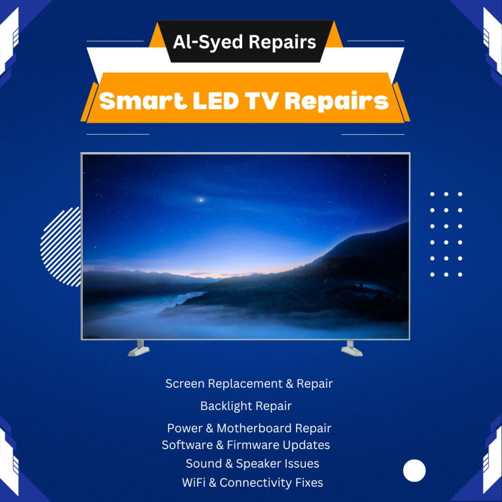 Smart LED, Laptop, and Computer Repair Services Smart LED, Laptop, and Computer Repair Services Screen Replacement & Repair Fixing cracked, flickering, or dead screens Backlight Repair Resolving dim or no display issues Power & Motherboard Repair Fixing TVs that won’t turn on or have power issues Sound & Speaker Issues Fixing low or no audio problems WiFi & Connectivity Fixes Solving network and smart feature issues Laptop & Computer Repairs Software Installation & Updates Installing OS (Windows/macOS/Linux) and other necessary software. Virus & Malware Removal Ensuring safe and smooth system performance Screen & Keyboard Replacement Fixing broken displays, faulty keyboards, and touchpads Hardware Repairs & Upgrades RAM, SSD, battery, and motherboard repairs. Data Recovery & Backup Restoring lost data and creating secure backups For more details or to book a repair, contact us today